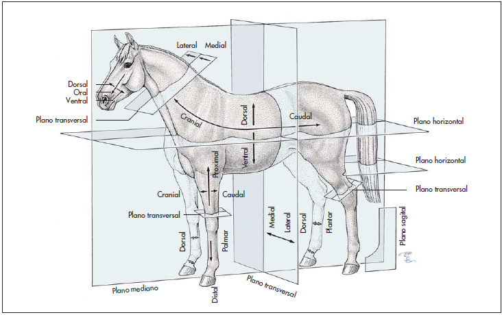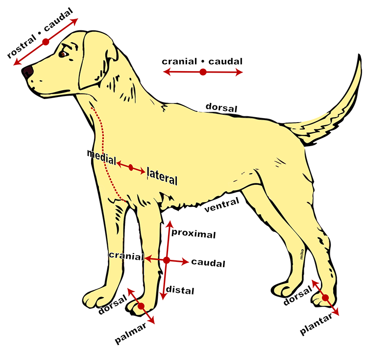 Ao adentrarmos no estudo sobre os planos de delimitação, secção e eixos, termos utilizados para designações de posição e direção do corpo dos animais, procure sempre visualizar o animal em sua posição natural (quadrúpede). Os termos empregados na descrição de posição e direção são utilizados para determinar posição do corpo e dos orgãos, identificação de estruturas, para realização de exames, defionição de planos ciriugicos etc.