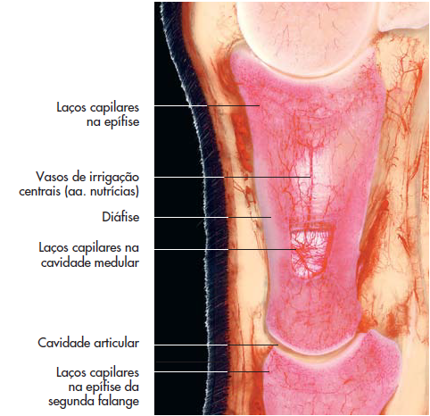 Figura 5: Vascularização de um osso longo, primeira falange equina (plastinação injetada). Fonte: Koning (2016).