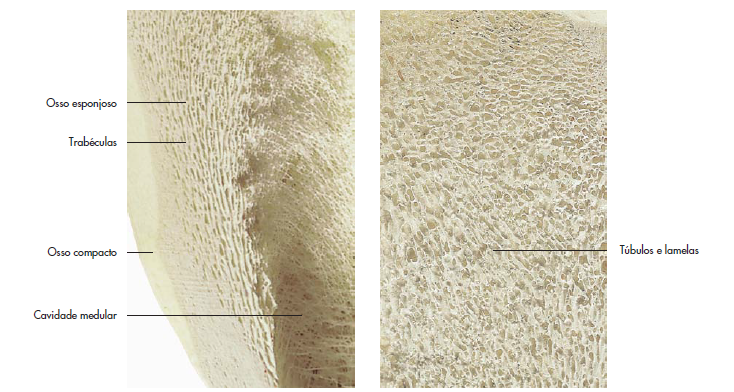 Também será estudada a arquitetura óssea, caracterizando o osso em compacto e esponjoso, observados melhor essa descrição em ossos longos. O osso compacto é formado por uma matriz óssea calcificada organizada em lamelas. O osso esponjoso é formado por lâminas ósseas e espículas desorganizadas que se entrecruzam. Os espaços entre as lâminas são ocupados por uma medula óssea. Esta pode ser classificada em vermelha e amarela. A primeira é encontrada nas epífises de ossoslongos, e atua na formação de células sanguíneas. A medula óssea amarela está presente na diáfise dos ossos longos, sendo formada por células adiposas.