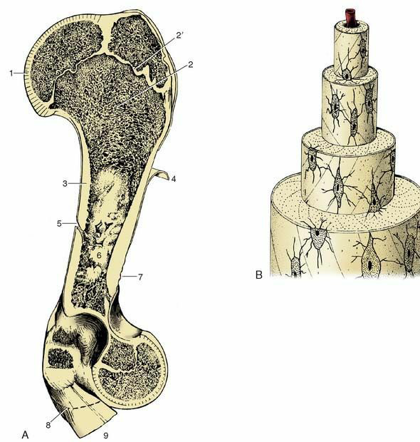 Figura 13: Medula óssea. (A) Osso longo (úmero bovino) seccionado longitudinalmente. (B) Osteônio com canal central: 1. cartilagem articular; 2. osso esponjoso; 2’. cartilagem fisial; 3. osso compacto; 4. periósteo, parcialmente rebatido; 5. forame nutrício; 6. cavidade medular; 7. área rugosa para inserção de músculo ou ligamento; 8. extensão distal do epicôndilo medial; 9. tendões de origem dos flexores do carpo e dos dedos. Fonte: Dyce (2010).