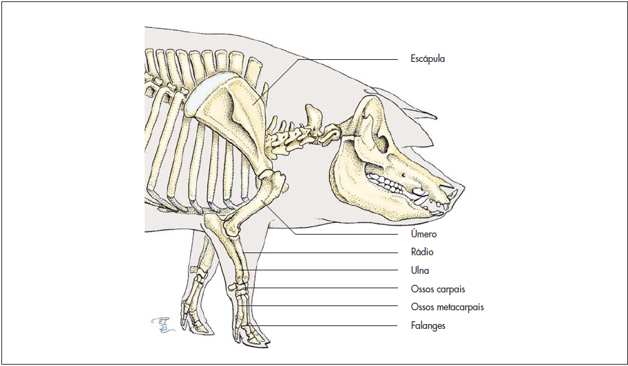 Figura 14: Membro torácico do suíno: ossos (representação esquemática). Fonte: Koning (2016).