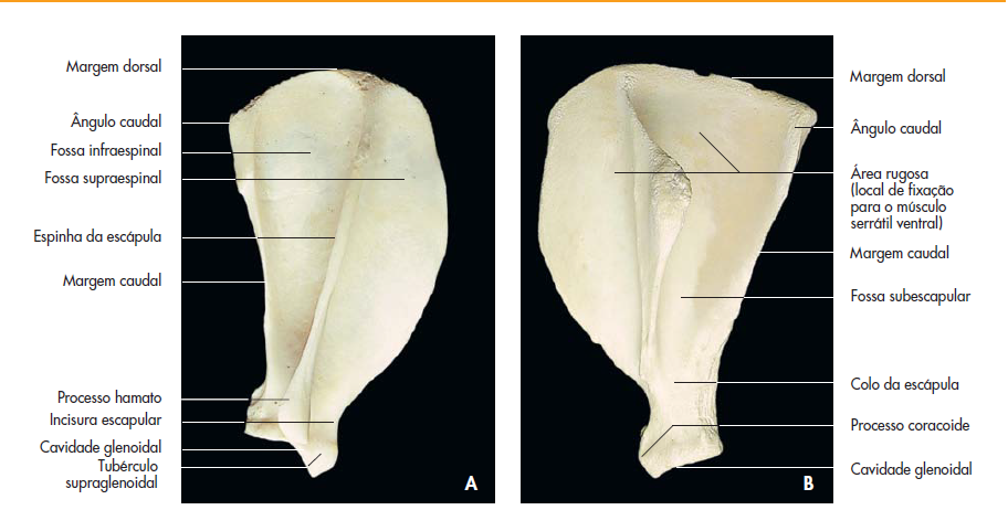 Figura 16: Escápula esquerda de um cão (A) e de um suíno (B) (vista lateral). Fonte: Koning (2016).