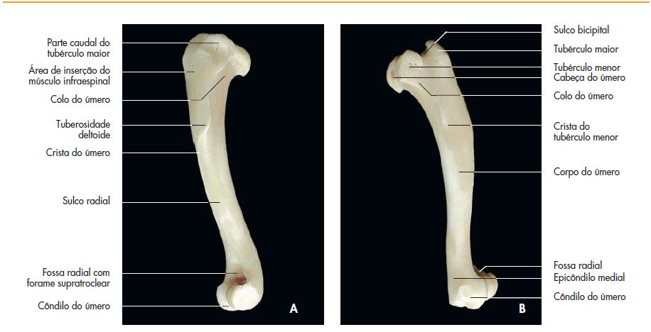 Figura 19: Úmero esquerdo de um cão (A: vista lateral; B: vista medial). Fonte: Koning (2016).