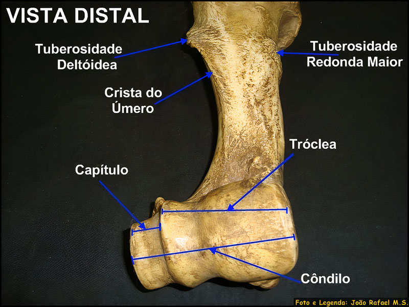 Epífise distal: tróclea, capítulo, fossas radial, coronoidea e do olécrano, sulco para o nervo ulnar e epicôndilos lateral e medial.