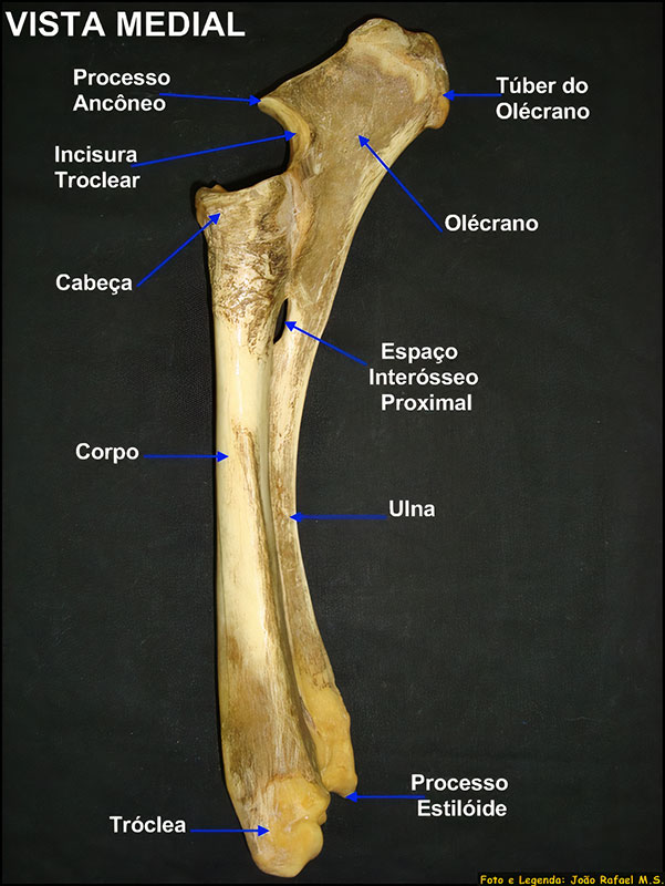 Epífise proximal: olécrano, processo coronoideo e incisuras troclear e radial.