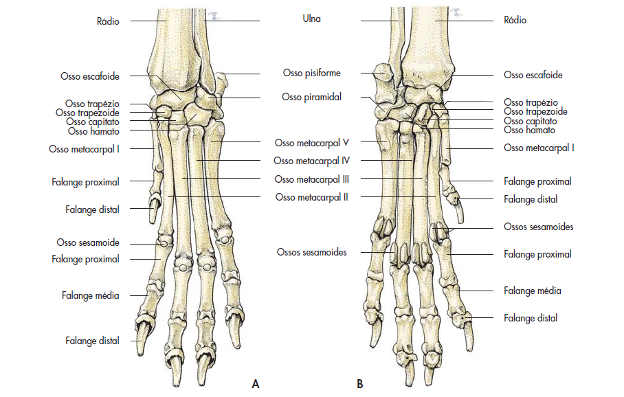 Figura 26: Esqueleto da mão esquerda do cão (representação esquemática, A: vista dorsal; B: vista palmar). Fonte: Koning (2016).