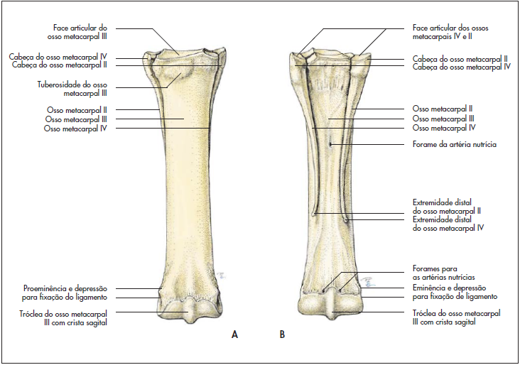 Figura 29: Ossos metacarpais esquerdos do equino (representação esquemática, A: vista dorsal; B: vista palmar). Fonte: Koning (2016).