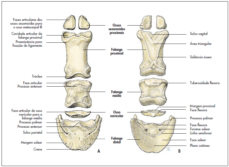 Figura 30: Esqueleto digital esquerdo do equino (representação esquemática, A: vista dorsal; B: vista palmar). Fonte: Koning (2016).