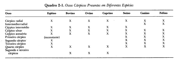 Quadro 1: Ossos cárpicos presentes em diferentes espécies. Fonte: Sisson; Grossman; Getty (1986, p. 59).